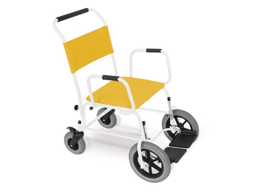 Transportní křeslo je osazeno zadními otočnými kolečky o průměru 200 mm, která zvyšují ovladatelnost a jsou vybavena nášlapnou brzdou.