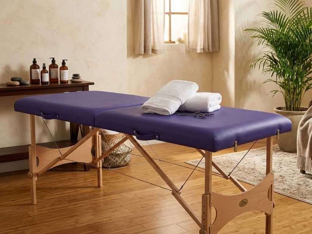 Přenosné masérské lehátko je vyrobeno z javorového dřeva bez dalších povrchových úprav a s čalouněním z omyvatelné koženky.