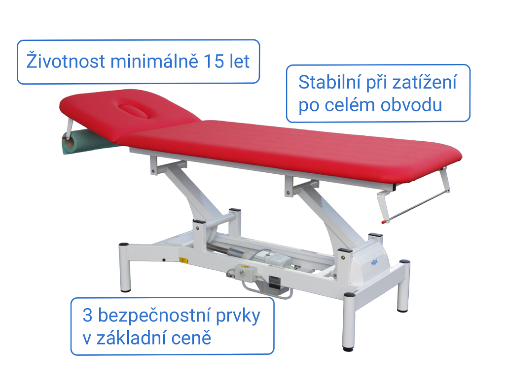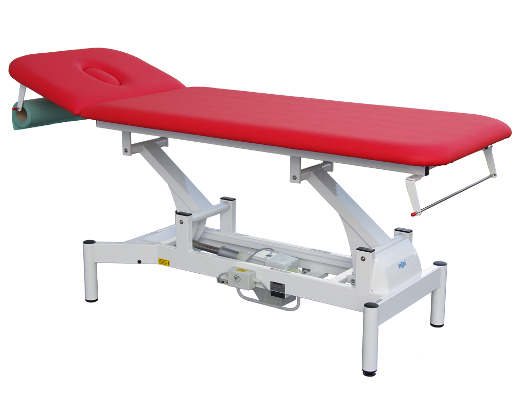 Polohovací rehabilitační a vyšetřovací lehátko s dvojdílnou ložnou plochou. Fyzioterapeutické lehátko je zvedáno s pomocí elektropohonu německé výroby. Více