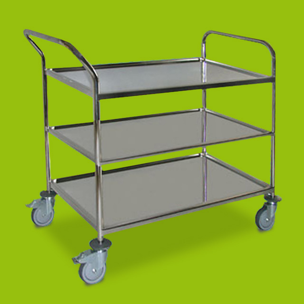 Pojízdný servírovací stolek VSN-1000 je vyroben z nerezového materiálu včetně tří plat.