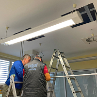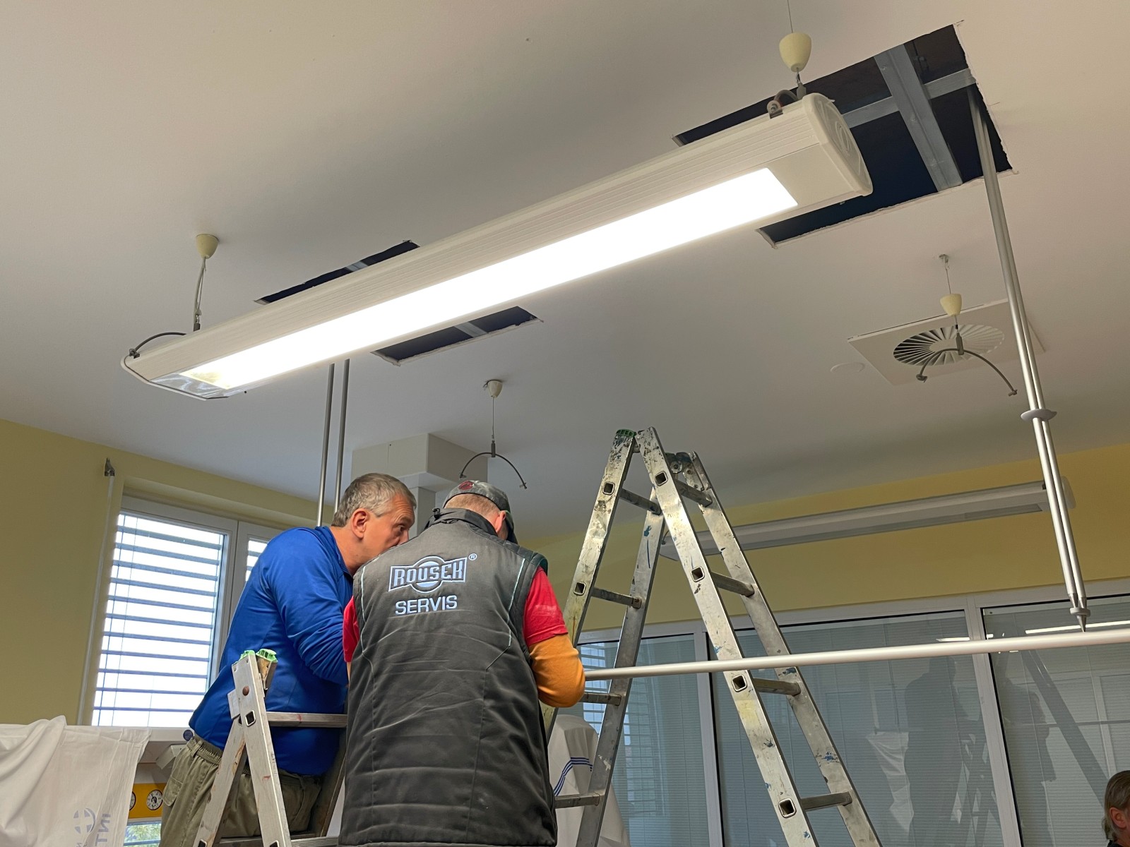 V tomto případě se jednalo o jednoduchou konstrukci bez kotvení do stěn, pouze s dvojitými držáky ukotvenými do stropu nad sádrokartonovým podhledem.